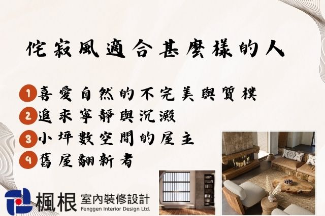 - 小坪數空間的屋主:侘寂風推崇的減少無謂的裝飾與空間留白,特別適合小坪數能有效放大空間感使小宅在視覺上更寬敞、通透。